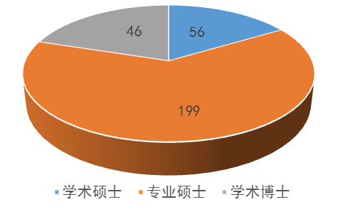 截至2022年底,在校研究生规模301人(同比增长6.7%),其中学术学位博士生46人,学术学位硕士生56人,专业学位硕士生199人,非全日制专业学位硕士生9人(表3,图1)。