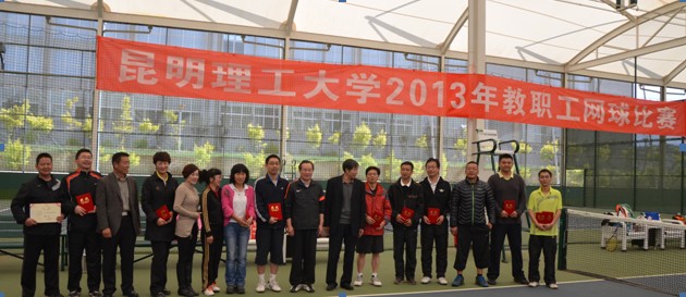 2013年教职工网球比赛在呈贡校区二号网球馆正式举行。黄金城共有六支队伍分别参加了混双和男子双打的比赛。