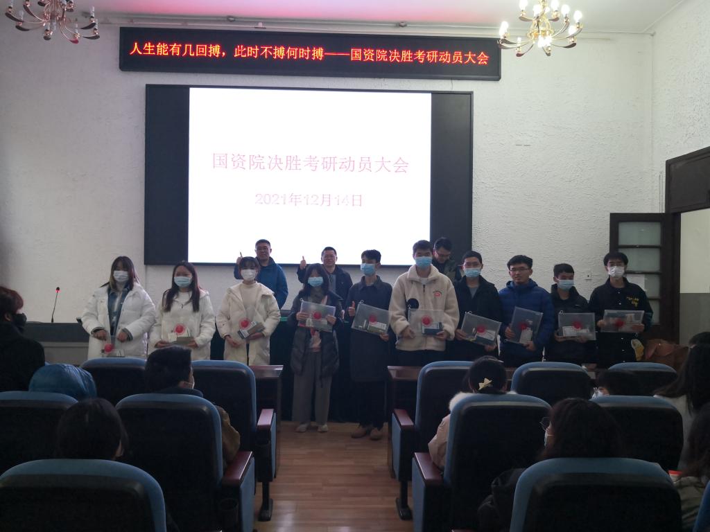于2021年12月14日上午11:00在国资楼第一会议室召开了“人生能有几回搏,此时不搏何时搏——国资院决胜考研动员大会”。院党委书记朱大明、院党委副书记李雨健、副院长李克钢、2018级辅导员薛丽华以及2018级209名考研同学参加动员会。