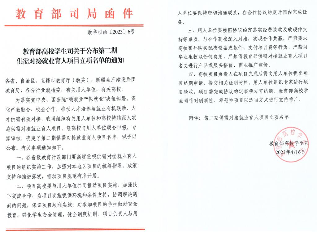 供需对接就业育人项目是为落实党中央、国务院“稳就业”“保就业”决策部署的重要举措之一,是深化产教融合、校企合作,推动学校人才培养与就业有机联动、人才供需有效对接的重要途径。该项目经高校与用人单位联合申报、专家审核确定立项,由教育部高校学生司组织有关用人单位和高校共同实施。