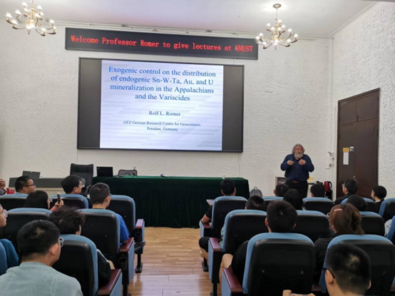 第一会议室为研究生和本科生做了“Exogenic control on the distribution of endogenic Sn-W-Ta, Au, and U mineralization in the Appalachians and the Variscides”的学术讲座。讲座详细介绍了Appalachians地区锡、钨、钽、金和铀成矿的关键控制因素及成矿机制,强调外因的风化和沉积作用导致成矿元素的初始富集是成矿的关键因素,开拓了学生视野。会后Romer教授专门针对国资学院师生交流了高水平论文写作的要点和如何做科学研究,(1)对于高水平论文写作,英语水平不是高水平文章发表的障碍,关键是看论文的内容是否有人做过,是否有独创的观点,中国学生需多读高水平文献,文章可以先写成中文再翻译,再找同领域国外专家润色一下,忌讳抄袭或者模仿他人论文语句。(2)对于科学研究,①要尽量多的扩充自己的知识面,多阅读高水平期刊的论文,把握热点问题;②认真做好调查,自己亲自参与实验的每一个过程,保证数据的可靠性;③要结合企业是实际需求开展研究,以解决实际问题为目标,而不应以发文章为目标。6月16日下午,Romer教授在主楼8楼会议室与云南省三江成矿系统与评价顶尖团队的师生们进行了面对面交流,听取了团队成员对前期研究工作的汇报,对团队正在开展的研究项目进行指导。Romer教授指出,团队目前的研究很有意义,建议更多聚焦一些具有全球性的,区域共性的、企业需求的且容易出成果的科学问题开展研究。