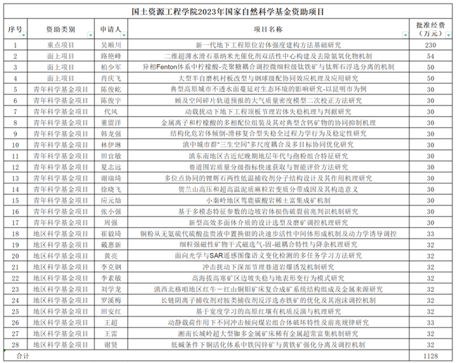 获批28项(重点1项、面上3项、青年13项、地区11项),获批总数再创历史新高,与冶能学院并列第一,其中地科系、测绘系均获批6项,资开系7项,矿加系9项;获批资助经费1128万元,位于全校第一。