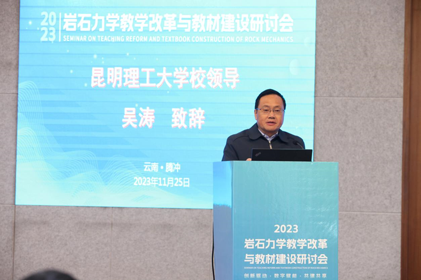 副校级领导吴涛致辞并表示这次研讨会是专为探讨岩石力学教学改革与教材建设而设,旨在通过集思广益,寻找更好的教学方法和策略,推动岩石力学学科的发展。
