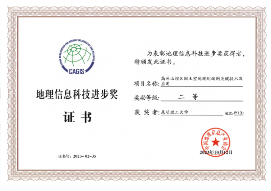 作为主要参与单位,与云南云金地科技有限公司、云南省国土资源规划设计研究院等5家单位联合申报的“高原山坝区国土空间规划编制关键技术及应用”荣获“地理信息科技进步二等奖”。