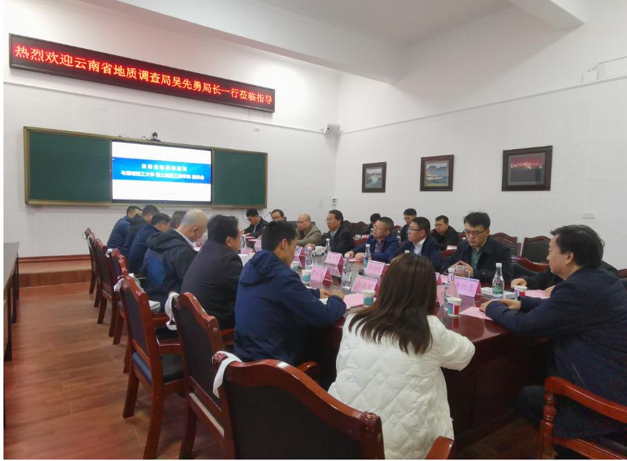 与云南省地质调查局在新一轮找矿行动、云南省自然灾害治理与防治方面的合作成效。云南省地质调查局党委副书记、局长吴先勇介绍了单位情况,对两家单位在自然资源部三江成矿作用及资源勘查利用重点实验室、高原山地地质灾害预报预警与生态保护修复重点实验室建设的合作成效给予了充分肯定。在充分交流的基础上,双方达成共识,明确今后进一步加强科技合作,发挥各自优势,不断拓展和深化在新一轮找矿行动、云南省地质灾害防治和治理方面的合作。