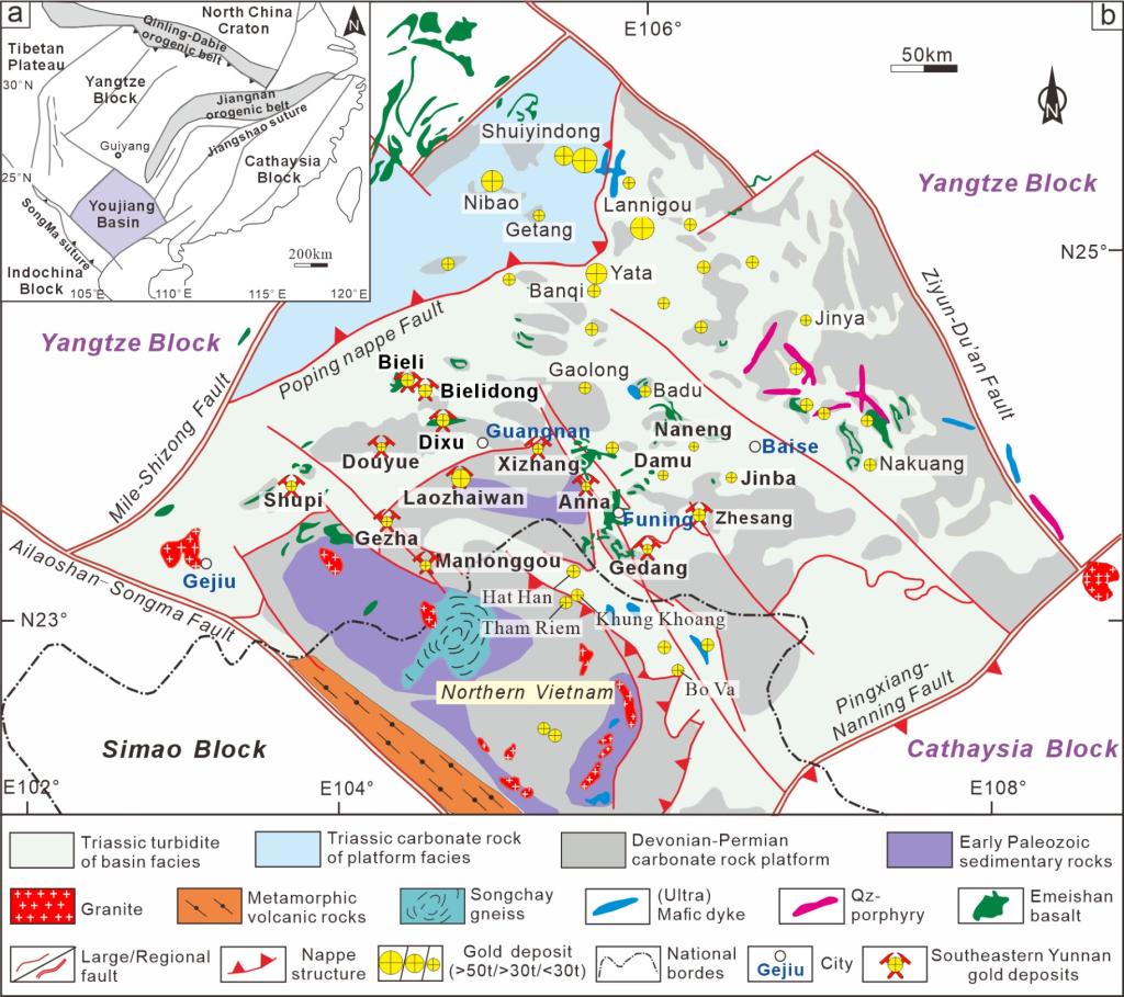 图1(a)右江盆地大地构造位置图;(b)区域地质简图及金矿床分布图