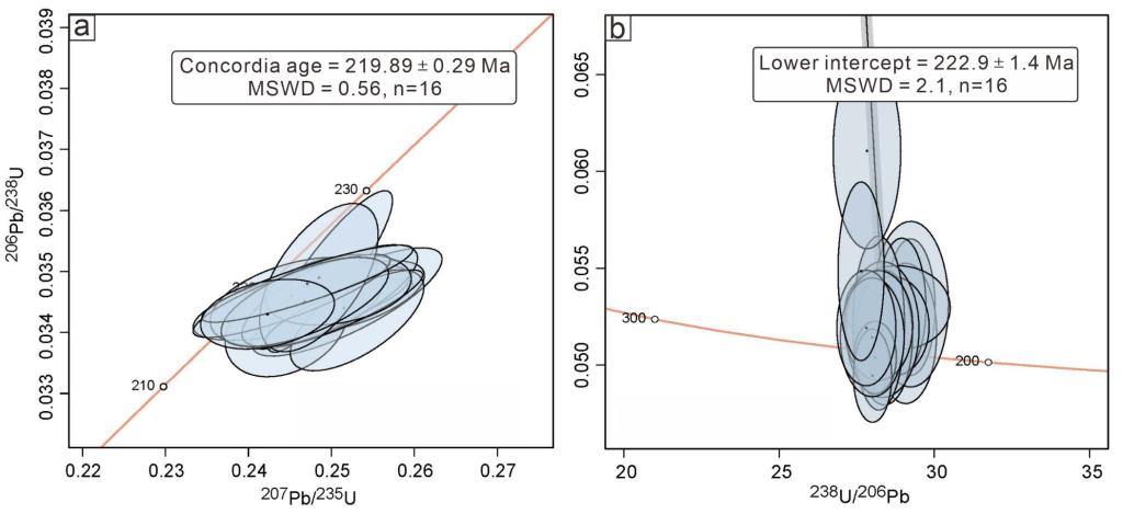 图3 底圩金矿热液锆石的谐和图(a)及Tera-Wasserburg U-Pb图解(b)