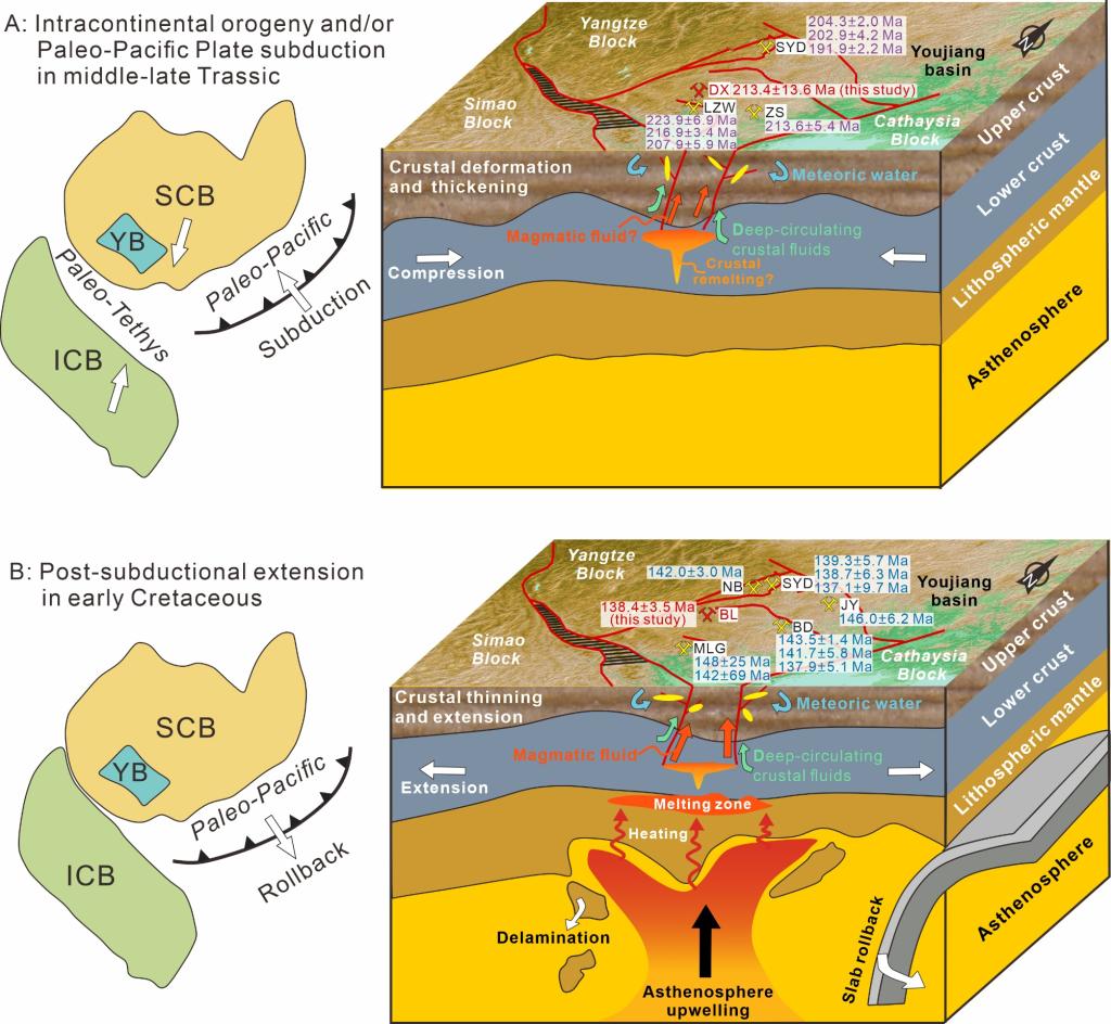 流体包裹体、H-O同位素及热液副矿物微量元素综合研究表明,右江盆地晚三叠世与早白垩世两期金成矿事件虽均发育岩浆-变质混合成因流体系统且存在大气降水混入,但流体组成比例差异显著,指示二者受控于截然不同的深部动力学过程(图4)。晚三叠世成矿流体以深循环壳源流体为主,形成于印支造山后期挤压-伸展过渡背景下的强烈水-岩相互作用;早白垩世成矿流体以岩浆热液为主导,响应古太平洋板块俯冲后期伸展构造背景下的强烈岩浆活动。上述成果揭示了构造体制从挤压向伸展转换对金成矿流体来源与运移路径的重塑机制。
