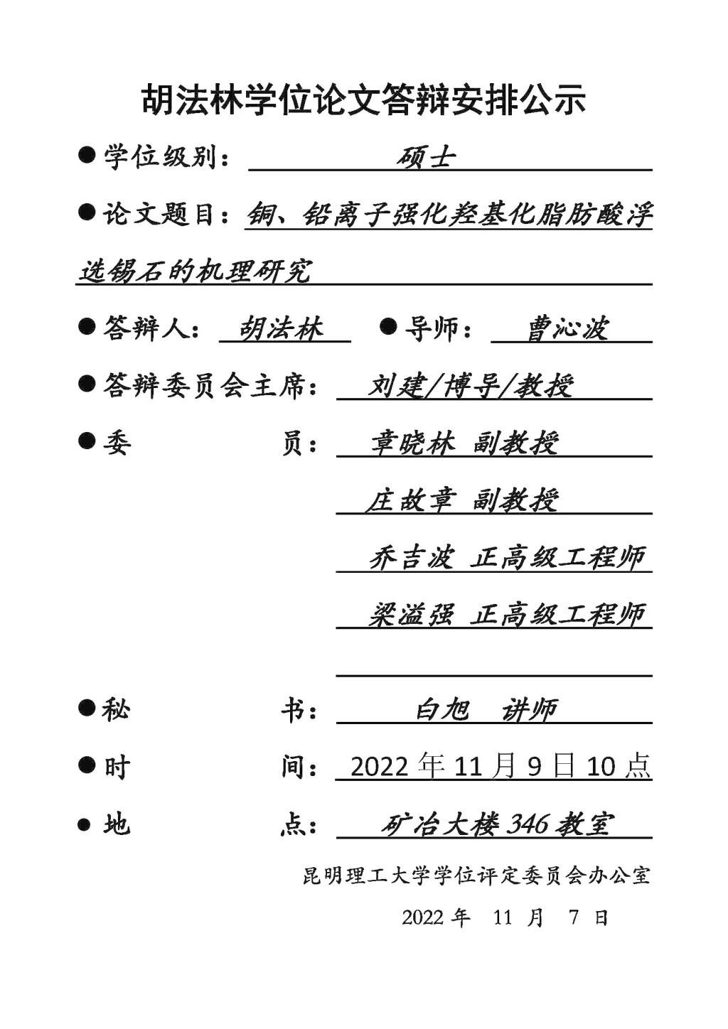 矿加系硕士胡法林学位论文答辩安排公示